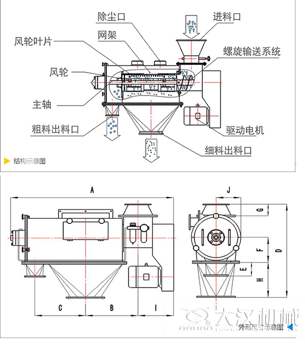 氣旋篩由振動電機、機座、篩箱、進出料推進裝置等組成。本機篩網(wǎng)為圓筒狀分布在機體內(nèi),物料由料斗經(jīng)螺旋輸送進入篩箱,風輪葉片連續(xù)轉(zhuǎn)動,對所篩選物料在篩箱內(nèi)不斷的更新推進,使物料產(chǎn)生運動沖向篩網(wǎng),過網(wǎng)物料從細料排出口排出,粗料則繼續(xù)向前從粗料排出口排出。