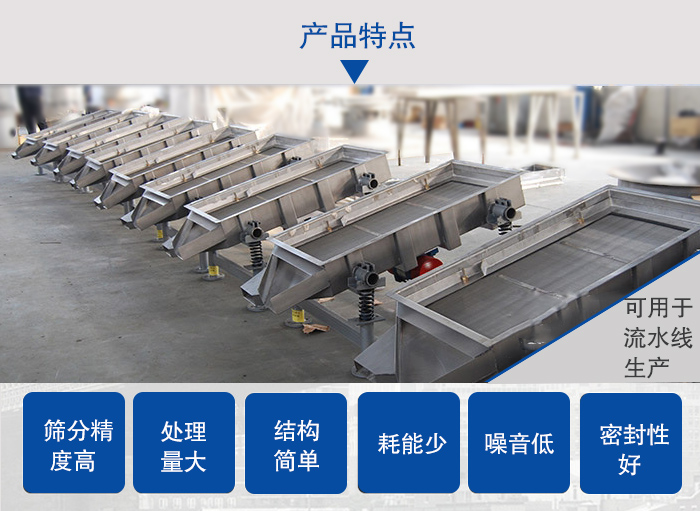 篩分精度高、處理量大、結構簡單、耗能少、噪音低、篩網使用壽命長、密封性好、無粉塵溢散、維修方便、可用于流水線生產中的自動化作業。