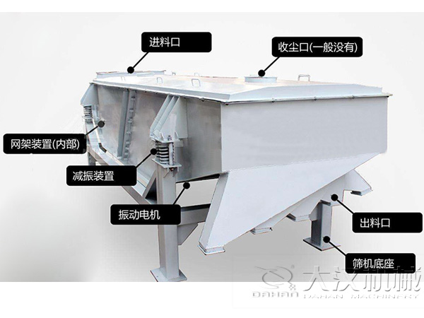 主要由篩箱、篩框、篩網(wǎng)、振動電機(jī)、電機(jī)臺座、減振彈簧、支架等部分組成。