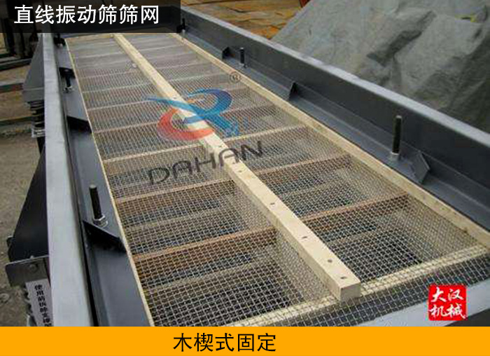 木楔式固定也被稱為楔形壓緊結(jié)構(gòu),是為了縮短拆裝螺栓螺母的時間同時保證振動篩篩網(wǎng)緊固的方法,應(yīng)用不多,主要常見于大型礦用直線振動篩的條縫篩結(jié)構(gòu)、沖孔板結(jié)構(gòu)、聚氨酯篩板結(jié)構(gòu)等。主要通過在篩箱兩側(cè)壁上,對稱的焊接兩條長角鋼,在其上方間隔一定距離焊接有一段短角鋼,并與長角鋼各成傾角。篩面支撐在兩角鋼之間,用木楔和木條壓緊。木楔遇水后膨脹,可以把篩面壓得很緊,該振動篩篩網(wǎng)固定方式中應(yīng)用的木楔也可根據(jù)需求換成聚氨酯材料,會更好的將篩面與篩框壓緊,可靠性得到充分的保證。此法簡單可靠,更換篩面簡單方便。