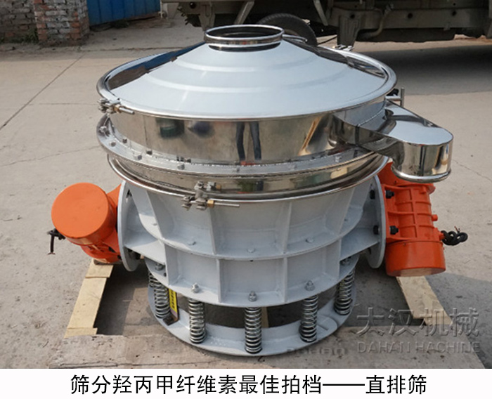 羥丙甲纖維素是纖維素中的一種,是從精致棉纖維素為原材料提取出堿纖維,然后制得的白色或類白色粉末狀物料,密度為1.39g / cm3,通常行業標準要求的羥丙甲纖維素顆粒度為100目通過率大于98.5%,80目通過率100%,特殊規格的粒徑40~60目。那么由此我們可以知道,通常我們篩分的羥丙甲纖維素的目數為80目左右,因此大漢機械據此給出了適合其篩分作業的設備——羥丙甲纖維素直排篩。