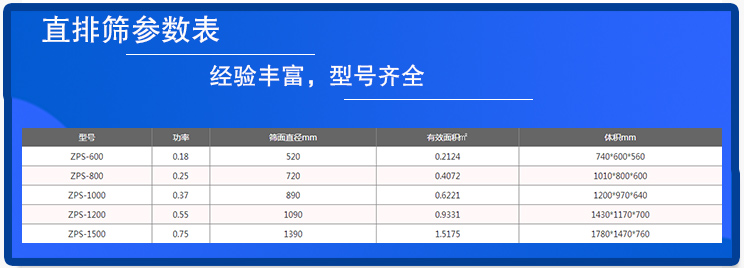 大漢自建廠已經(jīng)經(jīng)過(guò)了28個(gè)年頭,時(shí)間非常長(zhǎng),能夠生產(chǎn)的直排篩的型號(hào)一應(yīng)俱全,可以滿足大多數(shù)客戶的需要,具體的直排篩參數(shù)如上表所示。