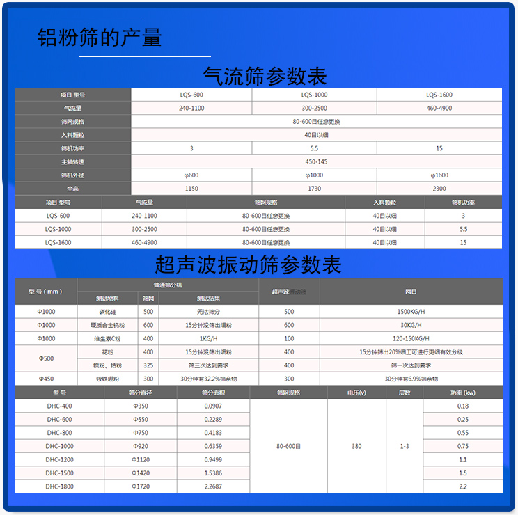 產(chǎn)量在很大程度上是振動(dòng)篩價(jià)格的決定因素,振動(dòng)篩的產(chǎn)量越高,其能夠在單位時(shí)間內(nèi)篩分出來的物料越多,工作效率越高,就能帶來更高的經(jīng)濟(jì)效益,所以鋁粉篩的價(jià)格是和所選的產(chǎn)量成正比的。詳情可參照超聲波振動(dòng)篩參數(shù)表和氣流篩參數(shù)表。